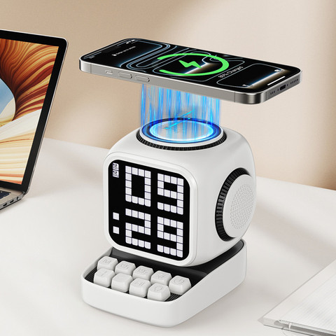 Cargador Inalámbrico Multifuncional de Escritorio con Carga Rápida, Ruido Blanco, Pantalla Táctil con Emoticonos, Pixel Art, Altavoz Inalámbrico Bluetooth
